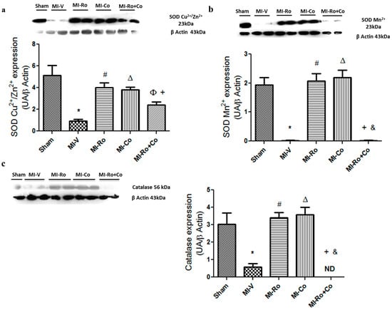Additionally, we analyzed the expression of myocardial SOD-Cu2+/Zn2+, SOD-Mn2+, and catalase. Figure 3a–c show that the expression of these enzymes was significantly diminished in the MI group when compared to the sham group. The administration of Ro and Co, was able to prevent a decline in the expression of the three antioxidant enzymes, maintaning values similar to those of the sham group. Interestingly, a combination of the compounds (Ro+Co) was not capable of producing the same effect that polyphenols alone; futhermore, our results show that there was no catalase expression in MI-Ro+Co group (Figure 3c).