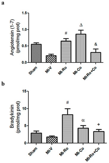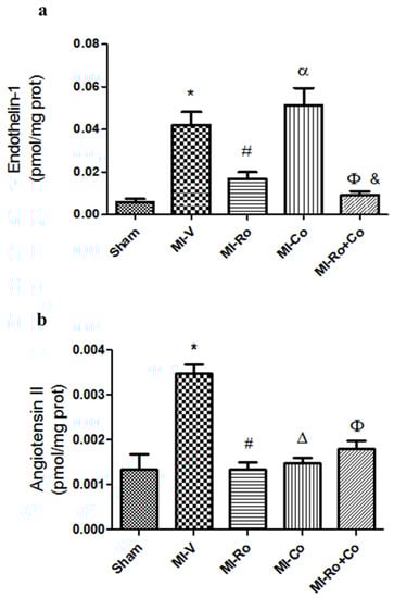In this work, we also evaluated the concentration of vasoactive peptides, such as Ang II and ET-1, which are both related to vasoconstriction. It has been shown that the concentration of ET-1 increases 3–4 h after the ischemic event, reaching a maximum in the first 24 h and remaining high after 48 h [8]. Our results demonstrate that this vasoconstrictor peptide increases significantly in infarcted animals, and that treatment with Ro, Co, and their combination significantly decrease its concentration (Figure 4a). Interestingly, this result is similar to that obtained by Corder et al. [33]. In their work, they evaluated the inhibitory effects of Co in an endothelial cell culture and demonstrated that Co is a potent inhibitor of ET-1 synthesis. Furthermore, Alici et al. [34] determined the effects of caffeic acid phenethyl ester (CAPE), one of the main components of Ro, on the concentration of ET-1 in a rat model. They concluded that the treatment with CAPE decreased ET-1 concentration and mediated a beneficial effect on parameters induced by sepsis.
