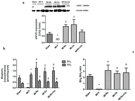 Ischemia inhibited endothelial nitric oxide synthase (eNOS) expression in hearts from the MI-V group, whereas treatment with natural compounds improved the expression of eNOS, bringing values closer to those of controls (Figure 7a). It is known that in order to produce NO, eNOS requires the presence of BH4. In our study, MI affected the production of BH4 and BH2 in an opposite way. While BH4 decreased with the episode of ischemia, BH2 augmented (Figure 7b). Both of these effects were abolished by the treatment with Ro, Co, and Ro+Co treatments (Figure 7b,c).