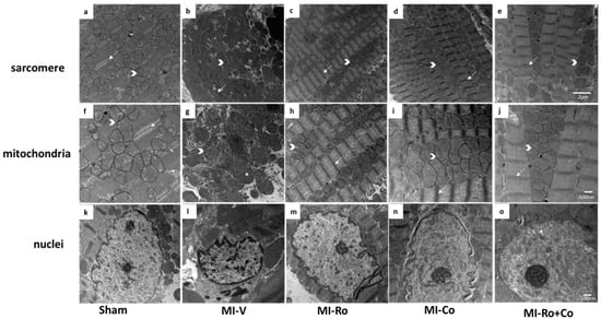 In all of the groups, the ischemic myocardial area was analyzed by electron microscopy. We observed that the sham group maintained the alignment of structure of the sarcomere and mitochondria (Figure 8a,f). Figure 8b,g,l show that the MI-V group had a generalized edema, loss of the structure of the sarcomere, shortened fibers and, therefore, increased sarcoplasmic space. These figures also illustrate swelling of mitochondria; in addition, chromatin underwent condensation in the periphery of the nuclear membrane. The group MI-Ro shows a structure similar to the sham group with a shortening of the sarcomere and loss of band I (Figure 8c,h,m); in the group MI-Co, mitochondria were slightly swollen and lost density (Figure 8d,i,n). Finally, the MI-Ro+Co group was similar to the sham group (Figure 8e,j,o).