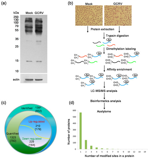 Proteome-wide identification of lysine acetylation sites and proteins in CIK cells in response to grass carp reovirus (GCRV) infection. (a) Lysine acetylation in GCRV infected or mock-infected cells as analyzed by Western blotting, β-actin was used as loading control; (b) Experimental strategy used to identify and quantify acetylated lysine sites in CIK cells in response to GCRV infection; (c) Number of identified and quantified lysine acetylated sites and proteins. The up-regulated and down-regulated sites and proteins were also indicated. The number of proteins was shown in brackets; (d) Distribution of acetylated proteins based on their number of lysine acetylation sites.