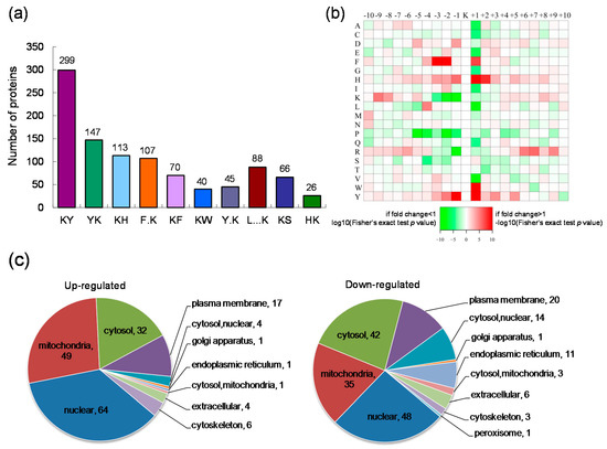 Motif analysis of the identified lysine acetylation sites and subcellular localization of the differentially expressed lysine acetylated proteins. (a) The number of identified proteins containing indicated lysine (K) acetylated motifs; (b) Heat map of the amino acid compositions around the acetylated lysine site (10 amino acids upstream and downstream of the K site). Red indicates abundant and green indicates least abundant; (c) The subcellular distribution of the up-regulated or down-regulated proteins.