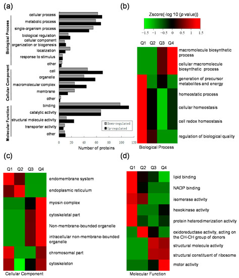 To better understand the preferred functional characteristics for the differentially expressed acetylated proteins in response to GCRV infection, GO enrichment based clustering analyses were performed by dividing all quantified proteins into four quantiles according to the H/L ratios: Q1 (0~0.67), Q2 (0.67~0.77), Q3 (1.3~1.5), Q4 (>1.5). In the biological process category, the process related with macromolecule biosynthetic was found to be significantly enriched in Q4, and the processes related to metabolites and energy were highly enriched in Q1. Besides, proteins related to homeostasis such as cellular homeostasis and cell redox homeostasis processes were also highly enriched in Q1 with down-regulated lysine acetylation (Figure 3b). In the cellular component category, the up-regulated proteins were highly enriched in the myosin complex, followed by the non-membrane-bounded organelle and the cytoskeletal part, while the down-regulated proteins were enriched in endomembrane system and chromosomal part (Figure 3c). Clustering analysis based on molecular function showed that the proteins with NADP binding activity, hexokinase activity and protein heterodimerization activity were enriched in Q1 (Figure 3d). In addition, the up-regulated lysine acetylation proteins were highly enriched in motor activity, which is consistent with the over-represented myosin complex in the cellular component category. Taken together, these results indicate that the differentially expressed acetylated proteins were involved in diverse biological processes and multifarious functions.