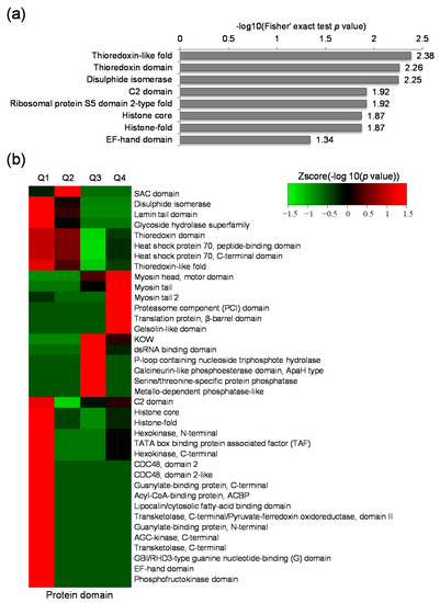 Protein domain structure is a conserved part of a given protein and can function independently of the rest part of the protein. To address the domain features of the lysine acetylated proteins altered by GCRV infection, domain annotation and enrichment analysis were performed. Results showed that thioredoxin-like fold domain, thioredoxin domain, disulphide isomerase domain were highly enriched (Figure 4a). Further clustering analysis indicated that protein domains involved in myosin tail, myosin head (motor domain), proteasome component (PCI) domain, translation protein (β-barrel domain) and gelsolin-like domain were highly enriched in up-regulated proteins (Figure 4b). The PCI domain was also significantly enriched in Q4, however, its function remains unknown. In the down-regulated proteins, various domains, such as histone core, histone-fold, glycoside hydrolase superfamily, CDC48 domain 2, CDC48 domain 2-like, guanylate-binding protein (C-terminal), acyl-CoA-binding protein, and so on were found highly enriched (Figure 4b). These data indicate that proteins with many kinds of domain features were changed in response to GCRV infection.