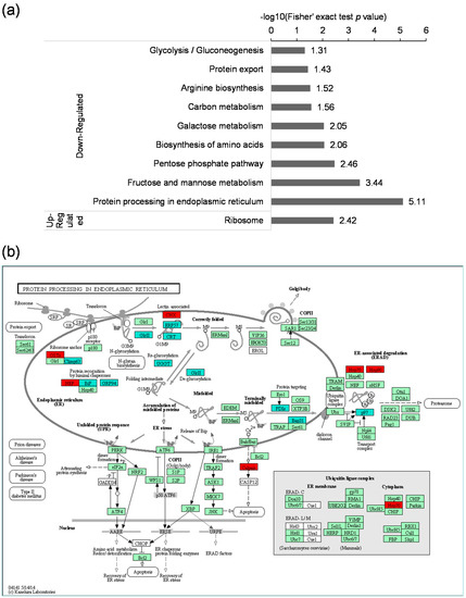 KEGG pathway analysis of the differentially expressed lysine acetylated proteins. (a) KEGG pathway-based enrichment analysis of up-regulated and down-regulated proteins; (b) The pathway obtained from KEGG pathway enrichment analysis. Changes in the lysine acetylation level of proteins in the protein processing in ER pathway in GCRV infected cells compared to mock-infected cells were indicated. The proteins in dark green are down-regulated, and the proteins in red are up-regulated. The proteins in light green are expressed at background level.