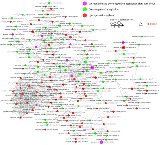 Interaction network of the quantified lysine acetylated proteins. The proteins associated with ribosome were shown in “△”. The proteins in green are down-regulated and the proteins in red are up-regulated. Proteins in purple were modified at different sites with both increased and decreased levels.