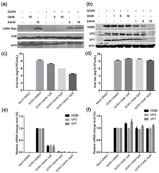 SAHA is a well-known pan histone deacetylase inhibitor, and can significantly increase the acetylation level of most histone lysine sites [30]. C646 is a competitive and selective inhibitor of p300/CBP histone acetyltransferase, and can impede intracellular histone acetylation in several cell lines [31]. Some previous reports have shown that SAHA had antiviral effects by suppressing HCV and RSV replication [21,22], and C646 has been found to inhibit the influenza virus replication [23]. To determine the effect of the drugs on host cells in response to GCRV infection, biochemical assays were further performed with histone lysine acetylation sequence-specific antibodies. As shown in Figure 7a, SAHA treatment significantly increased the acetylation level of host cells in H2BK16 with or without viral infection, while C646 treatment did not obviously affect the acetylation level. Subsequently, the effects of SAHA or C646 treatment on viral infection and replication were also investigated using antibodies against viral nonstructural protein NS80 and capsid proteins VP3 and VP7. As shown in Figure 7b, the expression levels of three viral proteins were down-regulated gradually following the increased concentration of SAHA, while no evident changes were detected with C646 treatment even when the concentration of C646 was reached 10 µM. To confirm the above data, the viral titers towards SAHA or C646 treatment were tested. Results showed that SAHA treatment decreased the viral titers approximately 4 logs by comparing to positive control, but no significant effect on the viral replication with C646 treatment was detected (Figure 7c,d). To further prove whether C646 or SAHA affects the viral protein expression or viral replication through gene transcription, quantitative real-time PCR analysis was carried out. As shown in Figure 7e,f, the relative mRNA levels of GCRV proteins NS80, VP3 and VP7 obviously reduced with 1 µM of SAHA treatment and decreased more with the increased concentration, whereas the mRNA levels were not distinctly changed by the C646 treatment. All together, these data indicated that SAHA treatment can inhibit the viral infection in a dose-dependent manner, but C646 treatment cannot significantly affect the viral replication.