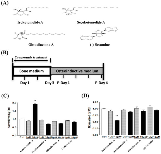 Determining the cytotoxic effects of pure compounds on BMSCs: (A) structures of the extracted pure compounds from the leaves of Cinnamomum kotoense; (B) treatment time-line for analyzing the osteoinductive effects of extracted pure compounds from C. kotoense on BMSCs, P-Day: day post OIM replacement; (C) cytotoxicity analysis of BMSCs after treatment with 0.01% DMSO as a control group or a variety of pure compounds at concentrations of 1 μM and 10 μM for one day via LDH assays; and (D) MTT assays were used to determine cell viability after treatment with pure compounds extracted from C. kotoense for three days. ** p < 0.01.