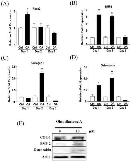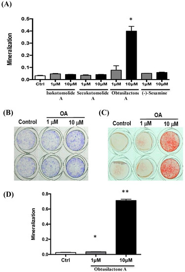 Obtusilactone A induced osteogenic differentiation of BMSCs: (A) pre-screening of the mineralization stimulatory ability of the natural pure compounds extracted from C. kotoense in BMSCs based on a mineralization assay; (B) determination of the ALP activity of BMSCs after treatment with 0.01% DMSO (control) or 1 and 10 μM OA for three days; (C) mineralization assay of BMSCs after OA treatment; and (D) quantified results of the mineralization assay. Data are presented as the mean of three independent experiments. The data shown are the means ± SD of 3 independent experiments. * p <0.05, ** p <0.01 for compounds-treated versus control groups.