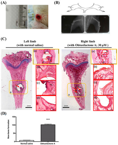 Evaluation of new bone formation via needle implantation of OA into the proximal tibial metaphysis of rats. OA (30 μM, 30 μL, once/two day) was locally administered into the tibia via a needle. (A) The cut tip of the needle (4 mm) and the posteriolateral side of the proximal tibial metaphysis in both hindlimbs. (B) Schematic view and X-ray film of the needle implantation side. (C) H&E staining of the needle implantation site in the OA-treated right tibia (right panel; enlarged a–d) and normal saline-treated left tibia (left panel; enlarged a–d) in rats after 14 days administration (green dotted line: the original size of the needle defect; red arrow: the new bone formation). (D) Quantified analysis of new bone formation inside the region of interest we selected as the original bone defect. *** p < 0.005.
