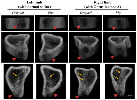 The observation was confirmed and quantified by Micro-CT reconstruction analysis. As shown in Figure 5, the original and flip images of the 3D reconstructed micro-CT results revealed that the beginning defect site (red arrow; Figure 5) and the new-formed trabeculae (yellow arrow; Figure 5). The results showed that the OA-treated tibias exhibited more trabecular formation in the bone marrow of the injection site than contralateral saline-treated tibias.