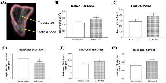 The 3D morphometric parameters show increased trabecular bone volume in OA-treated rat tibias. (A) Defined ROI for the trabeculae volume (inside the red dotted line) and cortical (between the red dotted line) bone volume analysis. (B) Cortical bone; and (C) trabecular bone volume measurement using micro-CT analysis CTAn software. Bone mass index of trabecular bone evaluation including: (D) trabecular separation (Tb.Sp).; (E) trabecular thickness (Tb.Th).; and (F) trabecular number (Tb.N). * p < 0.05.