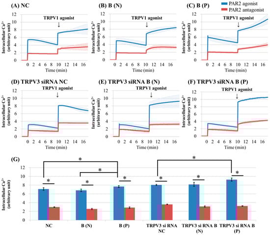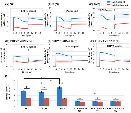 Ca2+ influx in cultured keratinocytes of: (A) Normal control; (B) nonpruritic burn scar; (C) pruritic burn scar; (D) TRPV3 siRNA transfected normal control; (E) TRPV3 siRNA transfected nonpruritic burn scar and (F) TRPV3 siRNA transfected pruritic burn scar; (G) intracellular Ca2+ levels at the time of TRPV3 agonist treatment. Each group was pretreated with PAR2 agonist (100 uM SLIGRL-NH2) or PAR2 antagonist (100 uM LRGILS-NH2); then TRPV1 agonist (1 uM Capsaicin) was added. PAR2 agonist induced intracellular Ca2+ influx in cultured human keratinocytes of normal (unscarred), and in nonpruritic and pruritic burn-scar tissues. After treatment with TRPV3 agonist, intracellular Ca2+ slowly increased in all keratinocyte groups except for TRPV3 siRNA transfected normal control keratinocyte. NC: keratinocytes from normal control; B (N): keratinocytes from a nonpruritic burn scar; B (P): keratinocytes from a pruritic burn scar; Error bars in (A–F): standard deviation of the mean value obtained from three experiments; Error bars in (G): standard error, each performed in triplicate.* p < 0.001.