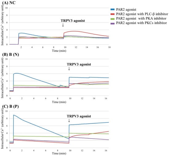The blocking of PKA and PKC is associated with reduced intracellular Ca2+ influx compared to the control when treated with PAR2 agonist or with additional TRPV3 agonist treatments (Figure 4).