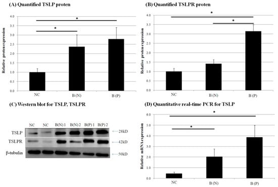 Expression of (A) thymic stromal lymphopoietin (TSLP) protein and (B) TSLP receptor (TSLPR) protein in normal and burn-scar tissues with or without pruritus was measured by (C) western blotting (WB). Expression of (D) TSLP mRNA was measured using quantitative real-time PCR in normal and burn-scar tissues with or without pruritus. The greatest TSLP expression of mRNA and protein was observed in pruritic burn-scar tissue using qPCR and western blotting (A–C). TSLPR proteins were also highest in pruritic burn-scar tissue via western blotting results (D). NC: keratinocytes from normal control; B (N): keratinocytes from nonpruritic burn scar; B (P): keratinocytes from pruritic burn scar; TSLP: thymic stromal lymphopoietin; TSLPR: thymic stromal lymphopoietin receptor; Error bars: standard deviation of the mean value obtained from three experiments, each performed in triplicate. * p < 0.001.