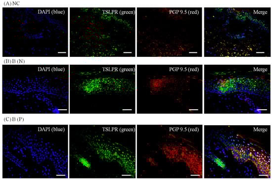 Three-color immunofluorescence confocal images were obtained for 4′,6-diamidino-2-phenylindole (DAPI), blue), TSLP (green) and protein gene product 9.5 (PGP 9.5, red) from tissues of (A) normal; (B) nonpruritic and (C) pruritic burn scars. The staining of TSLP, well observed in the spinous layer of the epidermis, was least in (A) normal control and greatest in (C) pruritic burn-scar tissue. NC: keratinocytes from normal control; B (N): keratinocytes from a nonpruritic burn scar; B (P): keratinocytes from a pruritic burn scar; TSLP: thymic stromal lymphopoietin. Scale bars = 50 μm.