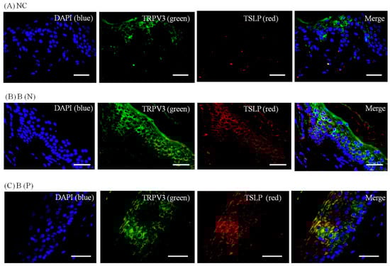 Three-color immunofluorescence confocal images were obtained for DAPI (blue), TRPV3 (green) and TSLP (red) from tissues of (A) normal, (B) nonpruritic and (C) pruritic burn scars. The staining of TRPV3 and TSLP, well observed in spinous layer of the epidermis, was least in (A) normal control and greater in (B,C) burn-scar tissues with or without pruritus. NC: keratinocytes from normal control; B (N): keratinocytes from nonpruritic burn scar; B (P): keratinocytes from pruritic burn scar; TSLP: thymic stromal lymphopoietin. Scale bars = 50 μm.