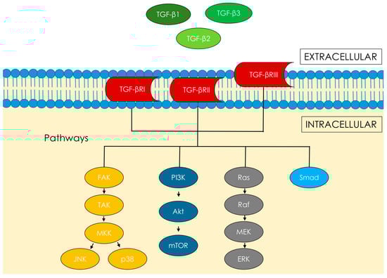 TGF-β is secreted as a large latent complex requiring local activation for receptor binding [57]. TGF-β mediates most signals through type I and type II receptors [58]. Type III receptor is a kind of a co-receptor for binding/presenting TGF and a regulator of TGF-β signaling [19]. The active receptor complex phosphorylates Smad proteins, which propagates the signal further [13,14,52,59,60]. The activated complexes will then regulate the transcriptional activity of various genes by many different pathways [19,52,59]. The links in this chain can be as follows: Smad pathway, PI3K/Akt/mTOR, the Ras/Raf/MEK/ERK signaling cascade, and focal adhesion kinase (FAK) [19,52]. The FAK-signaling activated by TGF-β is required for the activation of TGF-β-activated kinase (TAK) [19,61]. The TAK pathway can also be traced to p38 mitogen-activated protein kinases (p38) and nuclear factor κ-light-chain-enhancer of activated B cells NF-κB signaling [62] (Figure 1).