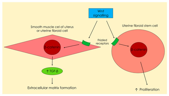 When talking about UF, it is important to mention Wnt signaling, a group of signal transduction pathways that are made of proteins which pass signals into a cell [63]. Wnt signaling pathways are activated by binding a Wnt-protein ligand to a Frizzled family receptor, which passes the biological signal to the specific protein inside the cell. This kind of signaling leads to the regulation of gene transcription [24,63]. The Wnt–β-catenin pathway plays one of the major roles in the functioning of the myometrium and UFs [24]. Certain studies have confirmed that β-catenin regulates and stimulates the renewal of stem cells [64]. Wnt–β-catenin and TGF-β pathways influence the clonal formation of UF tumors and their growth [2,65,66]. Tanwar et al., found that ovarian hormones may accelerate tumorigenesis via the described pathways in mouse models [66]. The Wnt–β-catenin pathway has a major influence on the stimulation of TGF-β3 expression [24,66] and TGF-β3 influences cell proliferation and tumor growth [24] (Figure 2).
