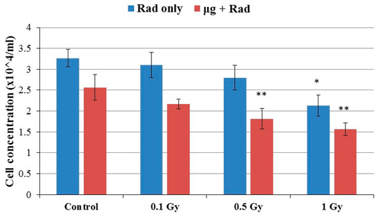 The number of cells/mL was determined after allowing 5-day cell culture with an initial concentration of 3 × 103 cells/mL. The cell concentration decreased significantly (one-way ANOVA: p = 0.0091 for radiation only and p = 0.0027 for microgravity and radiation conditions) as radiation dose increased. Furthermore, the assessed cell concentration was significantly (two way ANOVA: p < 0.0001) lower (0.7–1.0 × 104 cells/mL) when cells were previously incubated in simulated microgravity, indicating that microgravity itself negatively affected cell growth (Figure 1). Although cells grew slower after 1 Gy, the cell concentration reached 2.1 × 104 cells/mL, which was 65.6% of the non-radiated cells.