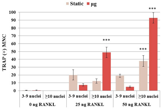 RANKL-dependent multinucleated cells formation under static and simulate microgravity. multinucleated cells (MNCs) with ≥10 nuclei significantly increases in microgravity compared to static condition (two-way ANOVA: p < 0.0001). The number of MNCs containing ≥10 nuclei increased significantly with increasing RANKL concentration in both static (one-way ANOVA: p = 0.0002) and microgravity (one-way ANOVA: p = 0.0001) conditions. Stars mean statistical significance compared to the corresponding control using Dunnett´s multiple comparison test (*** p < 0.005).