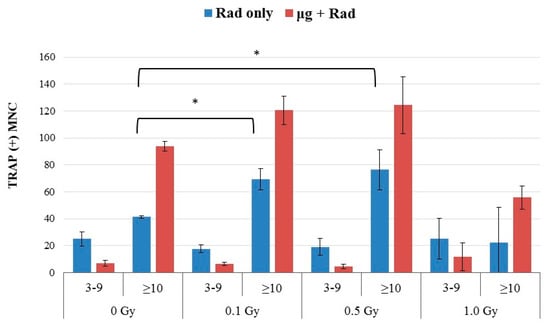Without simulated microgravity culture, radiation alone increased osteoclast differentiation. As shown in Figure 3, γ rays of 0.1, 0.5, and 1.0 Gy had little impact on the number of MNCs containing 3–9 nuclei. However, the number of GMCs increased significantly even for doses as low as 0.1 Gy, The GMC number appeared to peak at doses of around 0.5 Gy and decreased at doses of 1 Gy.