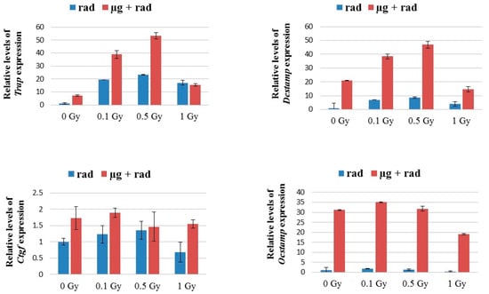 Expression of Trap, Ocstamp, Dcstamp, and Ctgf genes in response to different doses of gamma irradiation under the static (blue bars) and simulated microgravity (red bars) conditions. The increase in gene expression peaked at doses of 0.1–0.5 Gy. For all genes, except for Ctgf, expression was significantly higher in radiation + microgravity compared to radiation alone (two-way ANOVA of triplicates per each condition and dose; p = 0.0001).