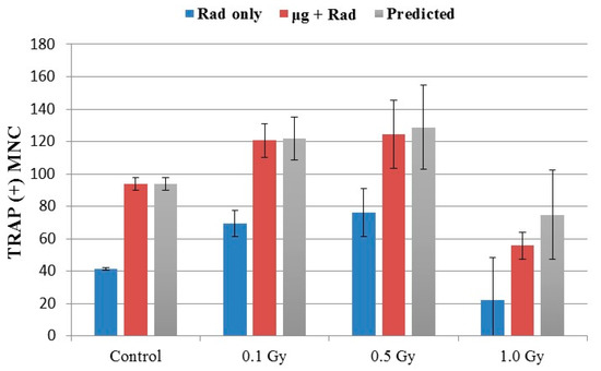One of the fundamental questions in space biology research is whether the combined biological effects of microgravity and exposure to cosmic radiation are synergistic. While studies addressing this question have been carried out for half a century in space or using simulated microgravity on the ground, the reported results have been conflicting, at least for DNA damage response endpoints [15,39]. With regard to bone loss, the combined effects have been reported in studies using mostly rodents with hindlimbs elevated to simulate the effects of skeletal unloading (HU) while being exposed to radiation [1,16,30,32,40,41]. Some of these studies reported the radio-sensitizing effects of hindlimb unloading in some, but not all bones. To determine possible synergism for MNC formation, we present, in Figure 5, the number of GMCs by radiation alone, and combined radiation and microgravity, against the predicted number based on the additive effects. It is shown that microgravity alone induced about 52(=94 − 42) GMCs per dish in comparison to the background (Figure 5, 0 Gy). The predicted number based on additive effects (gray bar in Figure 5) was then the sum of this number and the number of GMCs for irradiated cells. For all three doses of 0.1, 0.5, and 1 Gy, the GMC number in cells after combined exposure to microgravity and radiation agreed well with the prediction, suggesting that the effects of these two factors were additive. It is interesting to note that microgravity enhanced GMCs (~52 MNCs/dish) at levels that are more than that of radiation-enhanced (~33 MNCs/dish), even at the peak radiation dose of 0.1 or 0.5 Gy, suggesting that microgravity would contribute more to osteoclast differentiation than radiation in the presence of these two factors in space.