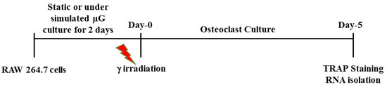 RAW 264.7 murine macrophage cells were purchased from American Type Culture Collection (Manassas, VA, USA) and maintained in static condition with Delbecco’s Modified Eagle’s medium (DMEM) with 10% fetal bovine serum (FBS) and 1% penicillin/streptomycin (Invitrogen, Carlsbad, CA, USA) in a humidified incubator at 37 °C with 5% CO2. NASA-developed ground-based rotating wall vessels (RWVs) were used to simulate the microgravity (µg) conditions. A Cs-137 γ source at NASA Johnson Space Center was used to deliver radiation of varying doses. Figure 6 shows the experimental timeline. RAW 264.7 cells suspended in complete media were cultured in rotation at 20 rpm or in a static condition for 48 h in a humidified incubator at 37 °C with 5% CO2. The cells were then removed from the incubator, and exposed to γ rays at doses of 0.1, 0.5, or 1 Gy. After irradiation, the cells were cultured for the formation of multinucleated osteoclasts. This study focused on doses of 1 Gy or lower that are relevant to space radiation exposure.