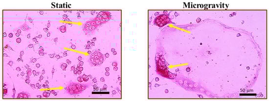 Multinucleated osteoclasts (pointed by arrows) formed in cells after a 5-day osteoclast culture in RANKL. Cells were maintained in static conditions or under simulated microgravity for 48 h immediately prior to osteoclast culture.