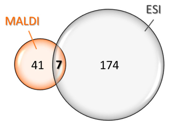 Figure 1 also demonstrates that electrospray is more efficient than MALDI for the detection of glycosylated peptides (181 vs. 48), and especially for the mass range above 3.5 kDa. However, because only seven peptides are found using both ionization techniques, it is important to notice that the two analyses remain perfectly complementary.