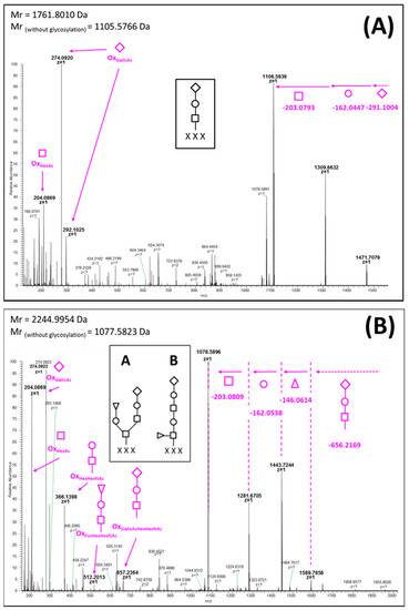 Monosaccharide diversity. In addition to previously observed Hex and HexHexNAc O-glycosylation, we detected two additional monosaccharide residues: sialic acid (Figure 2A) and fucose (Figure 3, glycoform B). In Figure 2A, the mass difference between the fragment m/z 1471.7079 (z = 1) and the protonated parent m/z 1762.8083 (z = 1), corresponds to the exact mass of a SA (Mexp = 291.1004 Da, Mth = 291.0954 Da). The oxonium ions reported on the MS/MS spectra at m/z 274.0920 and m/z 292.1025 are also characteristics of this atypical glycan. All this information clearly highlights the presence of SA in snake venoms, increasing the diversity of PTMs in peptide toxins. Based on the consecutive neutral loss pattern, a glycan structure is proposed in Figure 2A (insert). Harvey’s proposed O-linked carbohydrates nomenclature is used to illustrate all the glycan structures of this study [13]. Another glycopeptide carrying an unusual glycan has been characterized (Figure 2B). Neutral losses of 203.0809 Da, 162.0538 Da, and 146.0614 Da corresponding, respectively, to a loss of N-acetylhexosamine (HexNAc), hexose (Hex) and fucose (Fuc) were observed. Additionally, oxonium ions at m/z 204.0869 for HexNAc, m/z 274.0923 for SA, m/z 366.1398 for HexNAc-Hex, at m/z 512.2013 for HexNAc-Hex-Fuc, and at m/z 657.2364 for HexNAc-Hex-SA confirm the presence of these monosaccharides. Based on the molecular mass of the glycosylated peptide, neutral losses and molecular mass of the deglycosylated peptide (m/z 1078.5896, z = 1), two glycan structures are proposed for this toxin (Figure 2B).