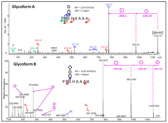 Glycoform diversity. Thanks to de novo sequencing and sequence homology with other sequences, different glycoforms of the same peptide were identified, as demonstrated Figure 3 with the peptide PRSHAAAA. Glycoform A (Figure 3, glycoform A) carries a HexNAc and a Hex, whereas Glycoform B possesses an additional SA. This example highlights the complexity of this snake venom, which is not only induced by the presence of analogous peptide sequences, discriminated by few mutations (Table 1), but also based on a variable content of PTMs, such as glycosylation, which is expected, following glycan synthesis pathway.