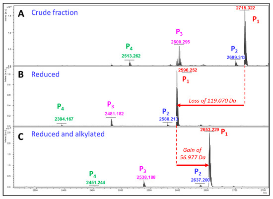Mass spectra of the S-Cys-GlycoDa-1 fraction in MALDI-MS acquisition. (A) crude fraction; (B) reduced fraction; and (C) reduced and alkylated fraction.