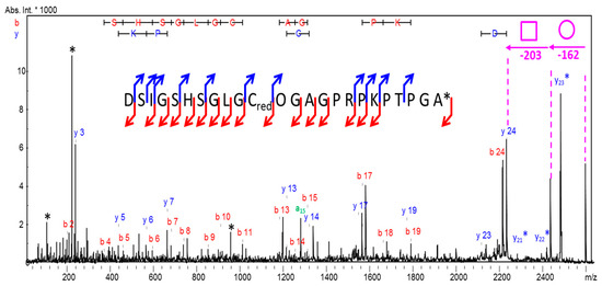 De novo sequencing of the m/z 2596 peptide in the S-Cys-GlycoDa-1 fraction; * internal fragments. Arrows indicate fragment ions identified in the mass spectra: a-type in green, y-type in blue and b-type in red. Carbohydrates are represented by the nomenclature proposed by Harvey et al. [13].