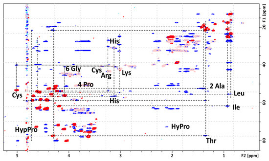 However, some side-chains, such as Cys and Asp were very difficult to detect because the signal intensity was at the limit of the noise level. In order to help with the assignment, GlycoDa-12 was synthesized without the HexNAcHex moiety and the Cys–SS–Cys. The comparison between the natural extract of GlycoDa-12 with the synthesized peptide allowed a straightforward identification of all the signals coming from the HexNAcHex. Eight CHO– and 2–O–CH–O– were identified without ambiguity. Unfortunately, because of severe overlap, the 2–CH2–O– could not be assigned with confidence. Since the synthesized peptide was not glycosylated on the threonine, the difference observed for the threonine Cβ chemical shift (Thr Cβ–OH: 4.2/70 ppm and Thr Cβ–O–Hex: 4.3/77.3 ppm) is a clear indication that the glycosylation in the natural GlycoDa-12 peptide took place on the threonine [17,18]. In order to identify the aspartate signals, the synthesized peptide was analyzed at pH 4.5 and pH 1.2. The CH2β chemical shift modification due to pH difference was then used to identify the aspartate that was the only amino acid that should show a different chemical shift in that pH range. Surprisingly, His signals that are unambiguously identified by the correlation between the Hß and the imidazole CHs show significant chemical shift differences for natural GlycoDa-12 relative to synthesized peptide that cannot be explained with the pH difference. It seems that His chemical shift might be affected by the presence of the glycosylation on the threonine. The comparison with the synthetized peptide lacking glycosylation and the Cys–SS–Cys disulfide bridge allowed the identification of the cysteine in the main peptide chain. In order to identify the –SS–bridged cysteine, free cysteine was added to the synthetized peptide at pH 7.8 to convert the reduced Cys–SH into oxidized Cys–SS–. Mass Spectrometry was used to follow the reaction and confirmed the addition of the cysteine. The comparison of both the synthetized peptide with reduced cysteine or with oxidized cysteine indicated a Cβ that was shifted from 24.6 ppm for a reduced Cys–SH, to 40.8 ppm for the oxidized Cys–SS– (Figure 7). This chemical shift difference corresponds to what is expected for Cys–SH and Cys–SS– [19,20].