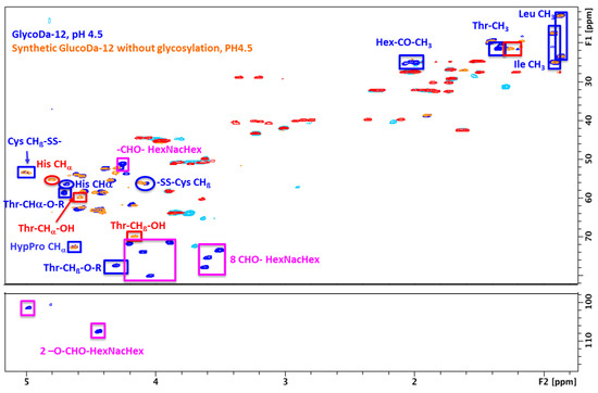Edited 13C–1H HSQC: overlay of the natural extract GlycoDa-12 (CH, CH3: blue/CH2: cyan) and the synthesized peptide with cysteine oxidized (CH, CH3: orange/CH2: red). The methyl signal for threonine, NAcetyl hexose, leucine, and isoleucine are indicated in blue boxes. The 10 hexose CH are observed in pink boxes. CHα for the two cysteines, the histidine, the hydroxyl-proline, and the threonine are labeled.