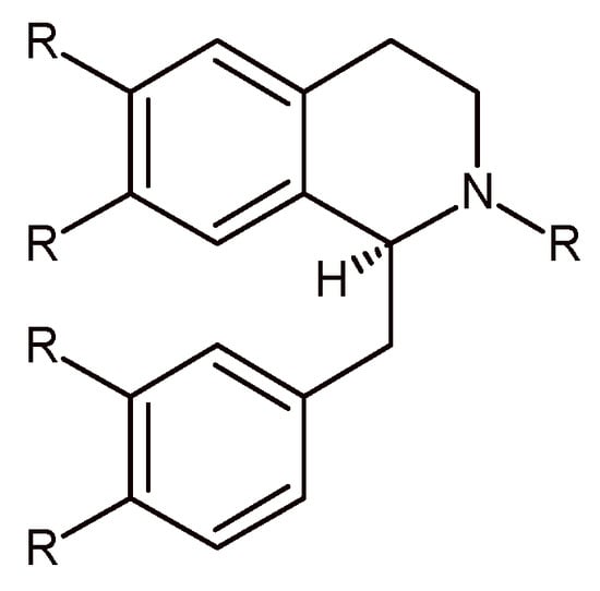 The general benzylisoquinoline skeleton (Figure 1) can be mostly synthesized (with few exceptions) by a cyclization reaction, namely, the Pictet-Spengler (P-S) reaction, which has been the subject of a huge number of review articles [,,,] and in 2011 has entered its second century of life [,]. Nowadays, the P-S reaction is still one of the most employed synthetic tools not only to yield tetrahydroisoquinolines (THIQs) and tetrahydro-β-carbolines (THBCs), but also to build novel scaffolds for structure-activity relationship studies and/or for combinatorial libraries for drug discovery programs.