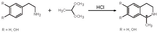 - Pictet, A.; Spengler, T. Formation of isoquinoline derivatives by the action of methylal on phenylethylamine, phenylalanine and tyrosine. Ber. Dtsch. Chem. Ges. 1911, 44, 2030–2036. [Google Scholar] [CrossRef]