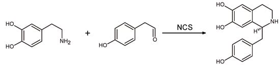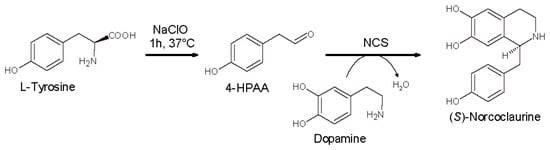 In the first step, 4-HPAA was generated by the oxidative decarboxylation of tyrosine in the presence of equimolar amounts of sodium hypochlorite. In the second step, dopamine and NCS were added to the reaction mixture in the presence of ascorbate to avoid catechol moiety oxidation. The process was carried out in phosphate buffer obtaining (S)-norcolaurinein 81% yield and 93% enantiomeric excess (ee).