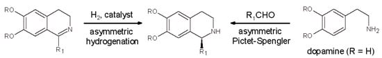 The major strategies that have been developed so far to synthesize the biologically active (S)-enantiomer of 1-substituted THIQ alkaloids are the following two []: (i) the Bischler-Napieralski cyclization/reduction sequence of dihydroisoquinoline intermediates; and (ii) the P-S condensation of β-arylethylamines such as dopamine with a variety of aldehydes (Scheme 3).