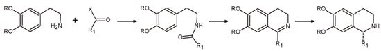 The Bischler-Napieralski cyclization/reduction sequence (Scheme 4) has been the most used synthetic approach for the asymmetric production of THIQs []. According to it, a β-arylethylamide undergoes a cyclization to 1-substituted dihydroisoquinoline or a corresponding dihydroisoquinolinium salt, followed by a reduction to tetrahydroisoquinoline. Transition metals such as ruthenium (Ru), rhodium (Rh), and iridium (Ir) have been successfully employed as chiral catalysts in the asymmetric hydrogenation of a variety of dihydroisoquinolines, resulting in high enantiomeric excess (ee) values with a growing number of substrates [,,].