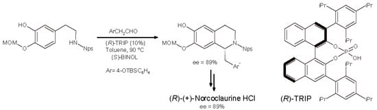 In 2015, a general approach has been described to the enantioselective synthesis of 1-benzyl-1,2,3,4-THIQs based on an asymmetric P-S reaction catalyzed by BINOL-phosphoric acid [(R)-TRIP] []. The novelty of the method has been the introduction of a moderately strong electron-withdrawing group on the nitrogen atom of the phenylethylamine, i.e., the O-nitrophenylsulfenyl (Nps) substituent (Scheme 5). Many biologically active alkaloids have been synthesized thanks to this approach, such as (R)-crispine, (R)-coclaurine, (R)-laudanosine, and (R)-calycotomine. (R)-Norcoclaurine was obtained as well as its hydrochloride salt (HCl), with 89% ee, and the same synthetic protocol with the (S)-TRIP catalyst might lead to the biologically relevant (S)-enantiomer.