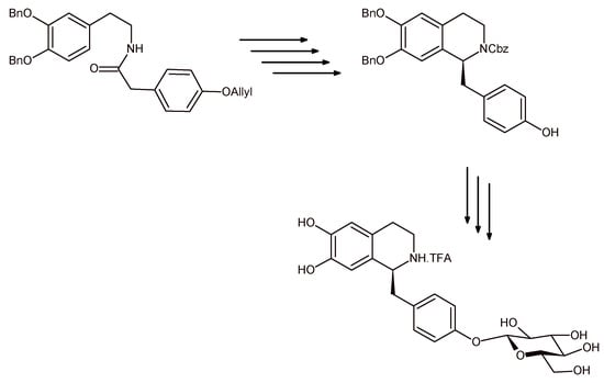Briefly, the Bischler-Napieralski cyclization/reduction sequence of a proper amide (Scheme 6) by employing RuCl [R,R-TsDPEN(p-cymene)] as the asymmetric catalyst yielded the (S)-N-Cbz-6,7-di-O-benzylnorcoclaurine, which, after the attachment of a glucosyl moiety to the p-hydroxybenzyl unit and subsequent deprotection gave the (S)-norcoclaurine-4′-O-β-d-glucoside as trifluoroacetate (TFA) salt in 93% yield and 95% diastereomeric excess.