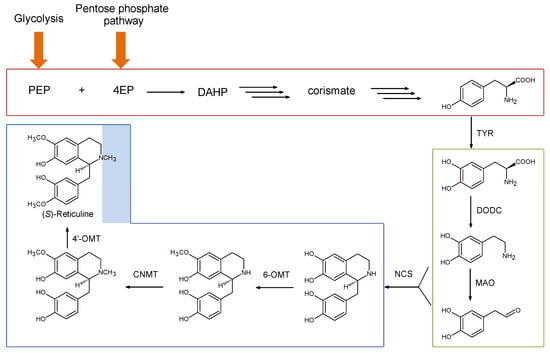 Metabolic pathways leading to the synthesis of (S)-reticuline in engineered E. coli strains. PEP: phosphoenolpyruvate; 4EP: eritrose-4-phosphate; DAHP: 3-deossi-arabinoeptulsonato-7-fosfato; DODC: l-DOPA decarboxylase; MAO: monoamine oxidase; 6-OMT: 6-O-methyltransferase; CNMT: coclurine-N-methyltransferase; 4′-OMT: 4′-O-methyltransferase.