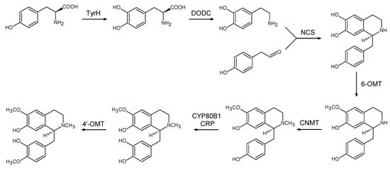 A further optimization of the process was achieved by combining enzymes from plants, yeast, mammals, and bacteria []. In this case, the first step was a modification of tyrosine metabolism to direct its flux through BIA pathway. Once the concentration of tyrosine was increased, heterologous expression of a mammalian tyrosine hydroxylase (TyrH), bacterial DOPA decarboxylase (DODC), and four enzymes associated with BH4 biosynthesis and recycling allowed to obtain 160 fold increase of (S)-noroclaurine, with fed dopamine without supplying exogenous tyrosine. As a final step, five enzymes from plant sources were incorporated (three methyltransferases, a cytochrome P450, and its reductase) to achieve the production of reticuline with a titer of 19.2 μg/L (Scheme 9).