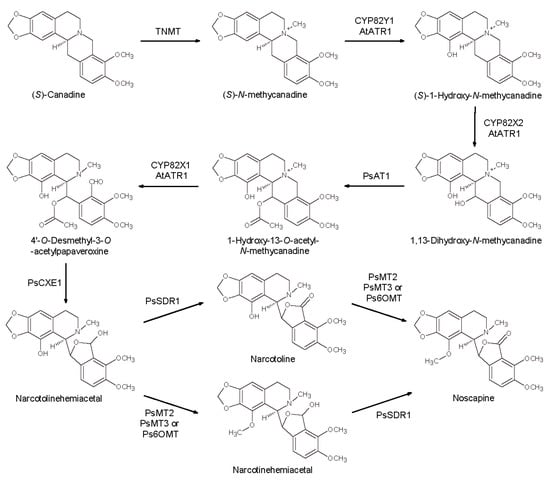 In 2016, the gene cluster leading to noscapine was reconstituted in S. cerevisiae achieving the microbial production of noscapine (titer of 1.64 ± 0.38 μM noscapine) and related intermediates []. Starting from canadine produced as described above, the authors developed yeast strains expressing different genes from P. somniferum (tetrahydroprotoberberine-cis-N-methyltransferase (PsTNMT), several cytochrome P450 monooxygenases (CYP82Y1, CYP82X1, CYP82X2), an acetyl transferase (PsAT1), a carboxylesterase (PsCXE1), a short-chain dehydrogenase/reductase (PsSDR1), a methyltransferase (Ps6-OMT)), and a cytochrome P450 reductase partner from Arabidopsis thaliana (AtATR1) (Scheme 10).