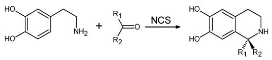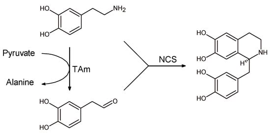 Aldehyde species were generated in situ by transaminase (TAm) starting from dopamine that in its turn reacts with the newly synthesized aldehyde in the presence of NCS to give norlaudanosoline with good conversion and excellent enantioselectivity.