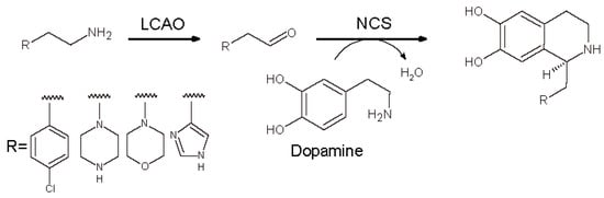 More recently the aldehydes to be used in NCS catalyzed reaction were produced by oxidative deamination catalyzed by Lathyrus cicera diamine oxidase (LCAO) that shows a broad substrate specificity towards several ethyl amines [,]. Our group set up a fully enzymatic synthesis of new chiral THIQs in two steps starting from dopamine and four different amines by coupling the activity LCAO with T. flavum norcoclaurine synthase (TfNCS) (Scheme 13). In this paper, four amines carrying morpholine or piperazine moieties were converted in the corresponding aldehydes and then used for the production of novel BIAs. All the reaction steps were performed in HEPES buffer.