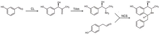 The first reaction step was catalyzed by carboligase (CL) that converted 3-hydroxybenzaldehyde and pyruvate in acyloin. In the second step, a transaminase (TAm) was used to form 2-amino-1-(3-hydroxyphenyl) propan-1-ol that in its turn reacted with phenylacethaldehyde in a NCS catalyzed Pictet-Spengler cyclization. The 1,3,4-trisubstituted-THIQ thus obtained was isolated excellent yield (92%).